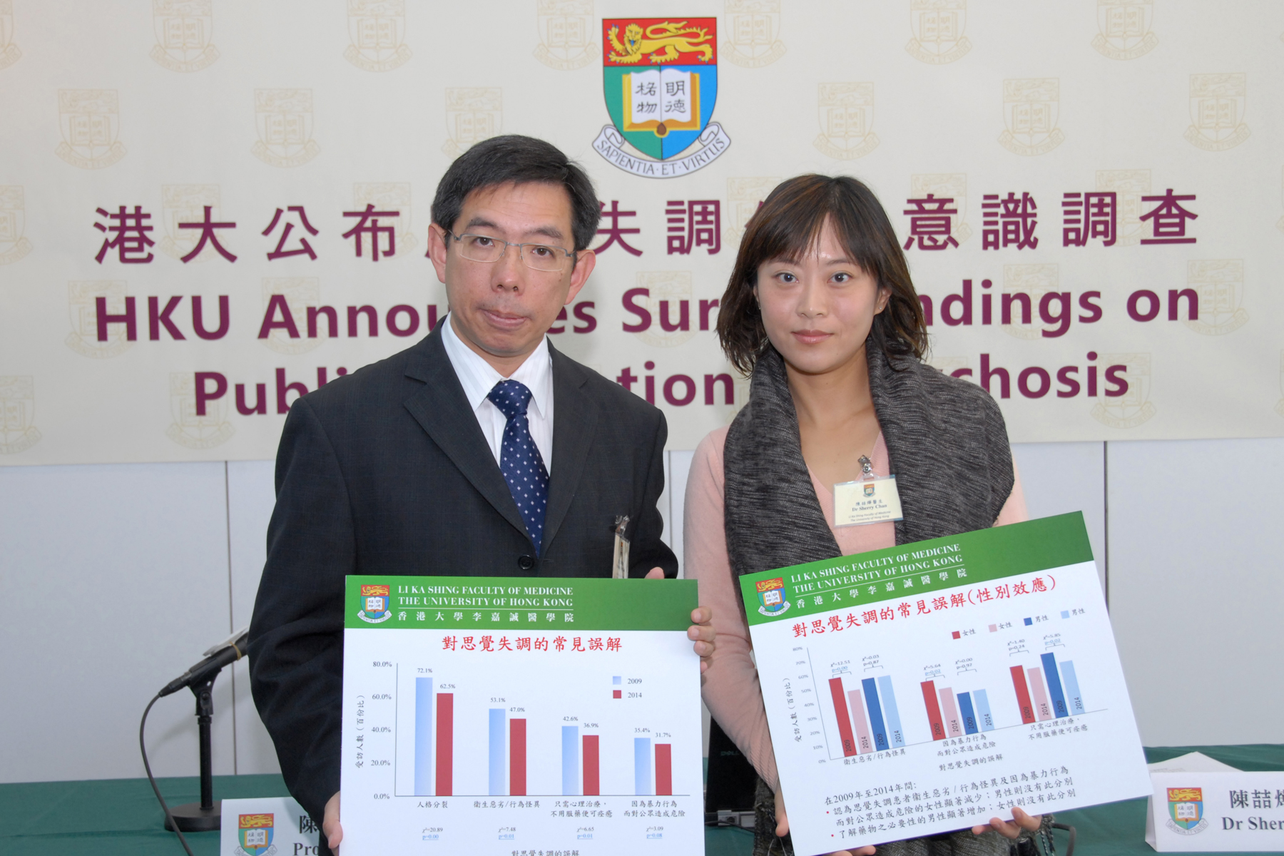 香港大學李嘉誠醫學院精神醫學系獲香港賽馬會慈善信託基金贊助,於2009年展開了對思覺失調的第一個全港性公共意識調查,並在2014年進行追踪調查。結果發現在過去5年間,市民雖然對於思覺失調的認識增加,誤解減少,但是對於思覺失調患者的態度及歧視卻沒有顯著改善。(左起)香港大學李嘉誠醫學院精神醫學系系主任及臨床教授陳友凱教授、香港大學李嘉誠醫學院精神醫學系臨床助理教授陳喆燁醫生。
