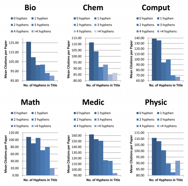 一項突破性的研究發現,學術論文的標題中如果包含連字符(hyphens),會對文章「引用率」(citation counts)和「期刊影響因子」(journal impact factors)的計算,産生不利影響,這現象發生於所有學科領域,而且與論文内容的質量無關。