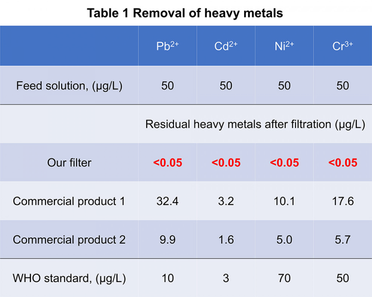 納米纖維濾膜對水中常見的重金屬離子如鉛和鎳等有優異的去除性能。以濃度每升50微克的鉛水作測試(世衛安全標準上限每公升含鉛10微克),納米纖維濾膜的鉛去除率高達99.9%以上。除此之外,其對鎳(來自水喉閥門等配件)及鎘、鉻(來自工業污染)也有99.9%以上的去除效率。過濾後水中重金屬離子濃度遠低於世界衛生組織所要求的飲用水安全濃度。(表一)