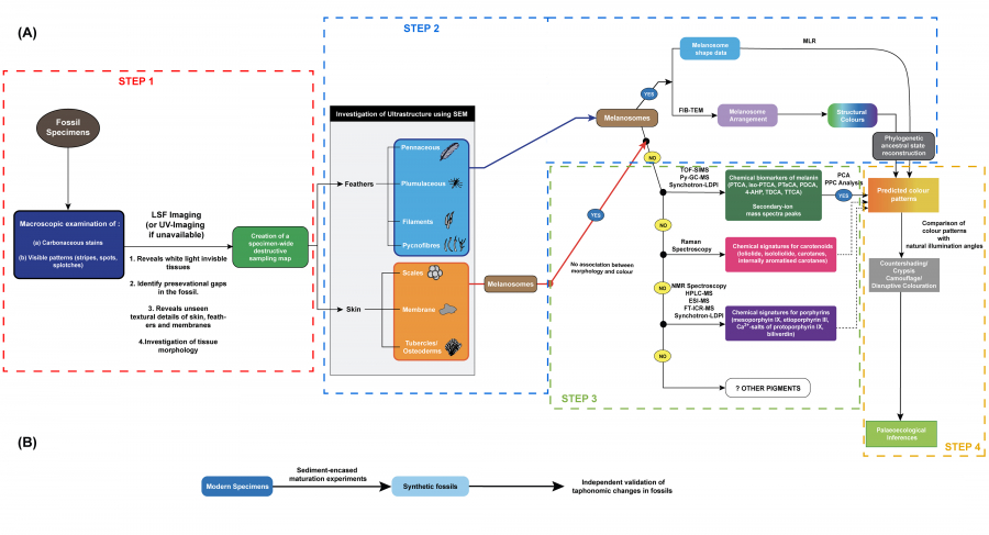 由文嘉棋博士、博士生Arindam Roy和國際團隊所提出的古顏色重建框架(圖4)有四大步驟:(1)在標本中分辨出已知或懷疑的顏色圖案;(2)利用電子顯微鏡尋找帶色素的微結構,例如顯微形狀能讓我們分辨出黑色素的顏色,如黑、灰和啡;(3)若找不到黑色素顏色,則使用高端化學分析技術去尋找其他色素的生物標誌物;(4)利用已重建的顏色圖案來驗證有關動物生理、生態和行為的假設。這個新框架考慮到各種色素的化學標記、化石中可見的大小型解剖細節,以及各種色素化石化的可能性。這個框架為顏色製造機制提供了基礎背景,並有助推進各種動物的顏色重建研究,其中包括非恐龍爬蟲類和哺乳類。