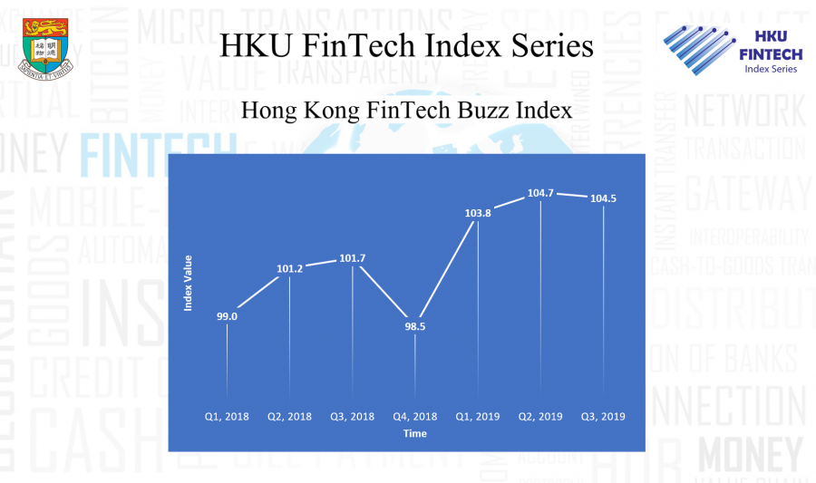 分析顯示,2019年多個季度的FBI都高於100,顯示公眾對金融科技行業的整體看法正面,為企業增加對業務發展的投資,以及政府制定更積極的政策推動行業發展提供誘因。然而, 2019年第三季度對比第二季度,指數值略有下降,從上升的趨勢中回落至104.5,這可能是受中美貿易的緊張局勢以及近期香港不穩定的政治環境等負面因素影響。政府預期未來一段時間經濟會進一步下行,金融科技行業也將面臨更多挑戰。