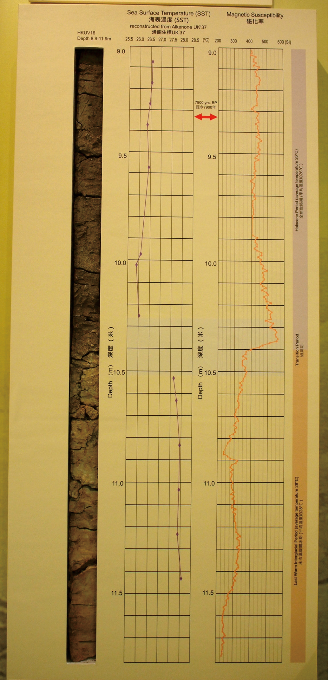 A preserved segment of an originally soft marine sediment core sampled from the northwest coast of Lantau Island in Hong Kong contains two sections of marine sediment showing the changes in sea level. The lower section was deposited in the last interglacial about 125,000 years ago, when the sea level was a few meters higher than the present and the sea water temperature was about 2°C warmer. Followed by a glacial period, sea level decreased so that the lower layer was exposed to air and oxidized to a yellowish colour. Records of the glacial period between the two layers are missing as sea levels then were too low for any marine sediment to be deposited. The upper section was deposited during the past 7000 years, i.e. the current interglacial.