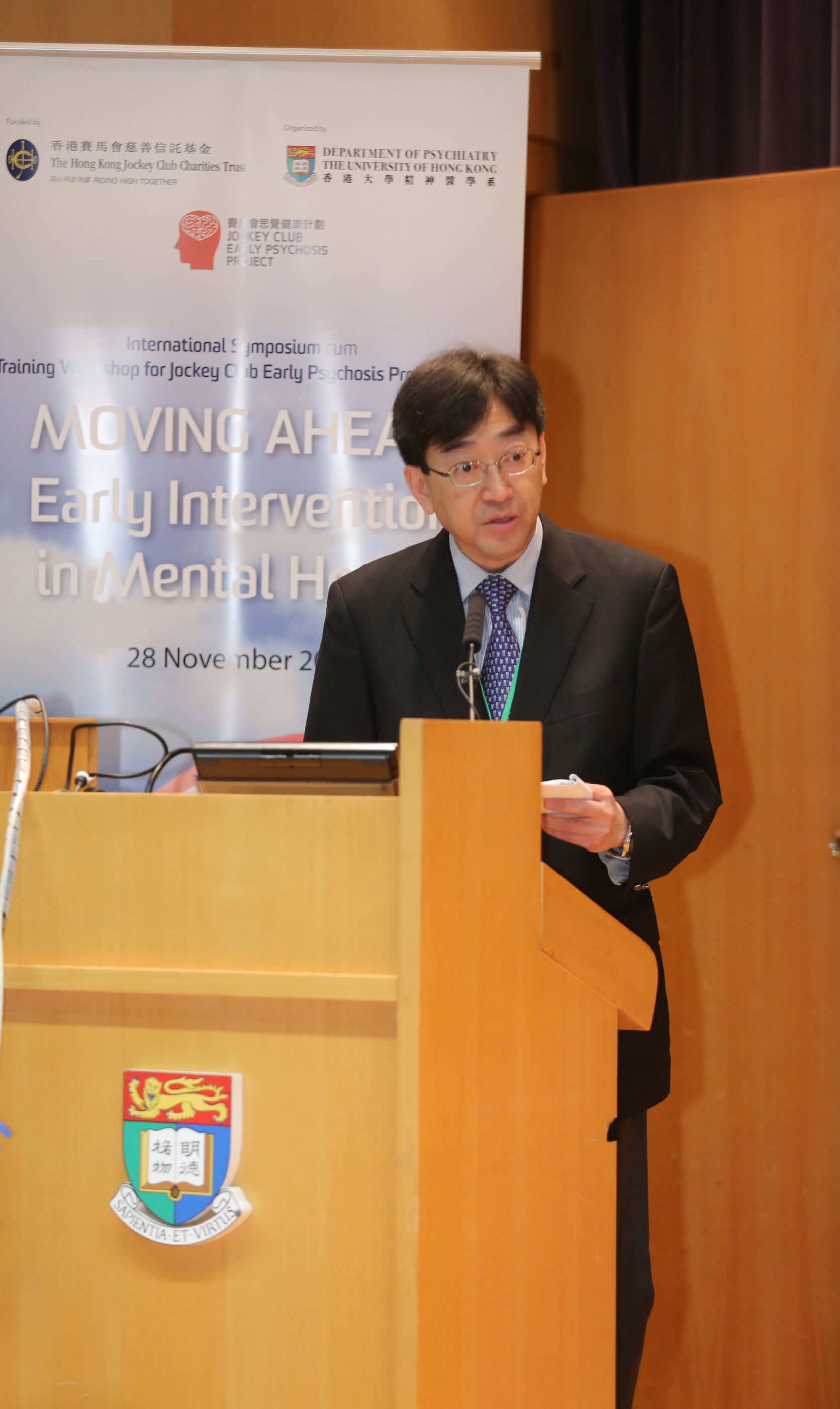 Funded by The Hong Kong Jockey Club Charities Trust, the International Symposium cum Training Workshop for the Jockey Club Early Psychosis (JCEP) : MOVING AHEAD: Early Intervention in Mental Health organised by the Department of Psychiatry of Li Ka Shing Faculty of Medicine, The University of Hong Kong (HKU) was opened yesterday (November 28). International scholars and experts gave presentations and shared professional insights. At the symposium, the JCEP team announced the research findings on the first initiative worldwide 4-year case management for adult-onset psychosis.