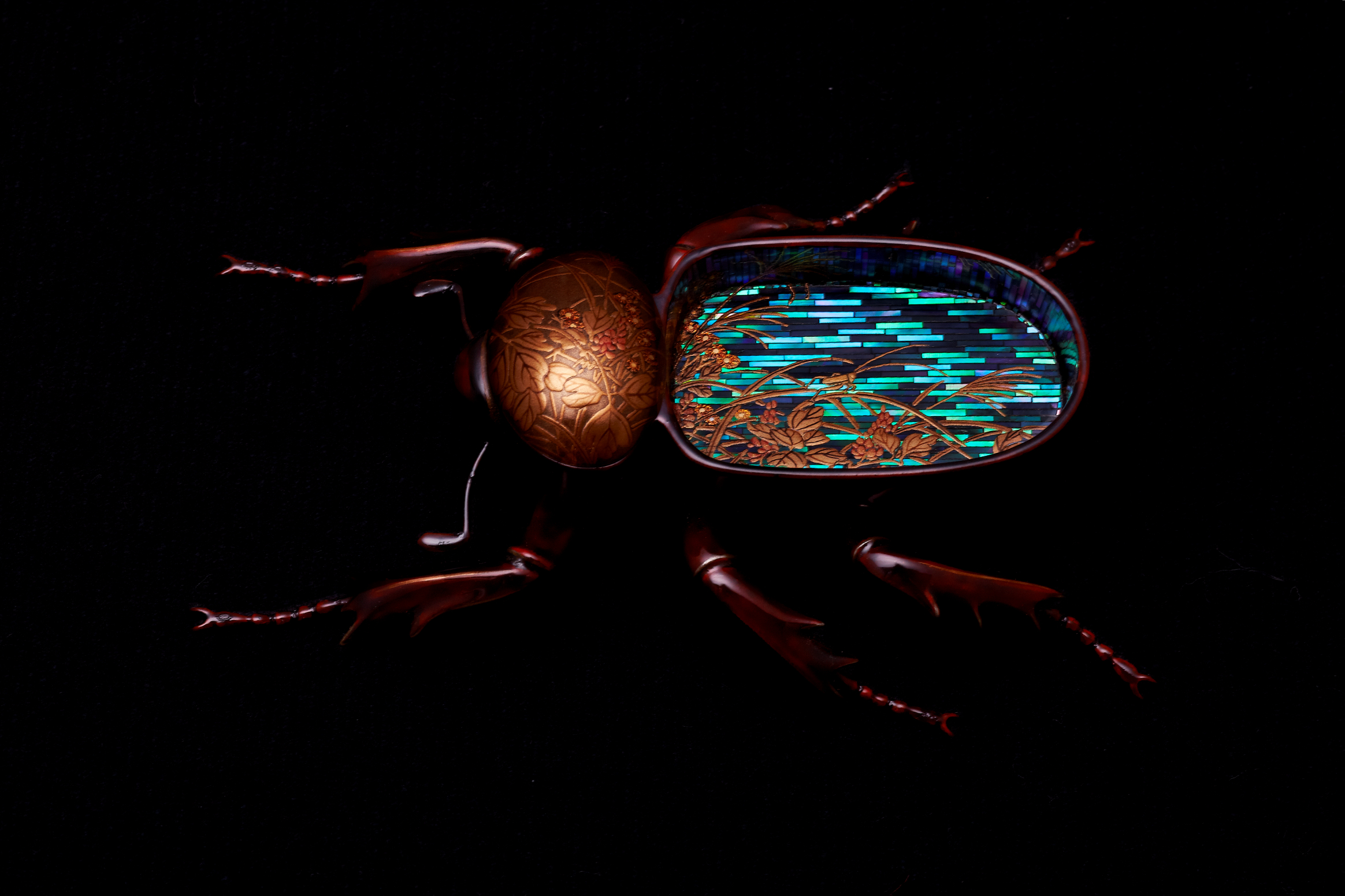 An acclaimed artist for 30 years, Wakamiya excels in the practice and teaching of traditional lacquer techniques with a high level of precision and has developed an interest in executing, in lacquer, East Asian objects historically made from unrelated materials, such as bronze or ceramic. His studio creates these imitations with such remarkable exactness that onlookers are fooled by the medium. The finely applied lacquer is, when held, much lighter than the metal or clay that it reproduces. A master of deception, Wakamiya and Hikoju Makie also specialise in the creation of life-like animals (beetles, grasshoppers), vegetables and fruits (corn, pumpkins).