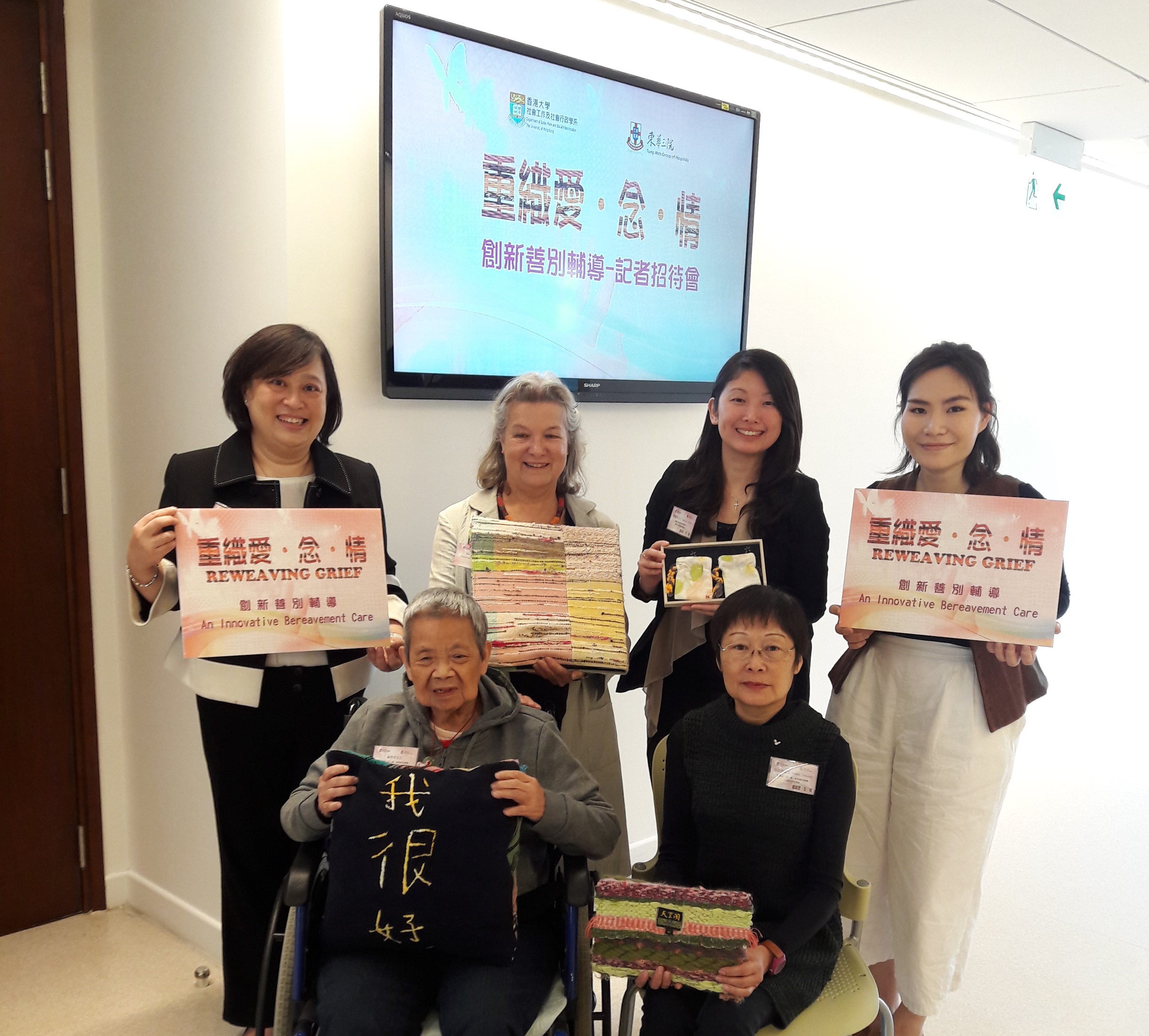 Project Director of Woven Memories, Australia, Ms Mary Burgess (back row, second on the left), together with (front row from the left) weaver of Reweaving Grief: Innovative Bereavement Care Ms Leung Hang-fong and service user Ms Hilda Cheung, display the unique keepsakes created by clothes and other fabrics of the deceased. Project coordinator, HKU Associate Professor Dr Amy Chow, is on the left of the back row. Ms Tsang Wing-yan and Ms Gallery Choi of TWGHs are the first and second from the right in the back row respectively.