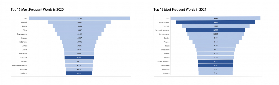 Keywords that appear the most have been extracted from up to 5,000 news articles over the entire year. In 2021, the top words included “Consumption” (消費), “Digital payment” (電子支付), “Greater Bay Area” (大灣區) and “Cross-border” (跨境). In 2020, the top words included “Platform” (平台) and “Pandemic” (疫情) in addition to “Digital payment” (電子支付). This indicates that digital payment has continued to be the focus of FinTech development, and in 2021 such development has largely been driven by motivations to boost consumption.