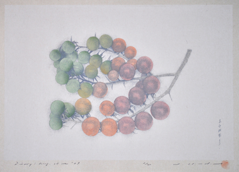 Technically, Noda combines photography, traditional Japanese woodblock printing, mimeograph duplication and silkscreen printing in a self-invented and meticulously modulated process of production and layering. Thematically, he regularly features his family and friends, self-portraits, landscapes, gifts and a series of plants that double as a documentation of his life. These techniques and themes have remained largely unchanged throughout his career. The result is a life-long chronicle of intricately poetic prints where the private and everyday are given heightened significance and universal resonance.
