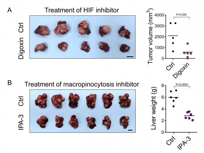 Macropinocytosis is an endocytic pathway that allows cells to engulf extracellular proteins. Through confocal microscopy, it was shown that hypoxia could cause HCC cells to exhibit 5-10 folds of induction of macropinocytic level. Through mass spectrometry analysis, the HKUMed team also found that the engulfed proteins were digested and degraded into amino acids which in turn served as fuel to support HCC cell proliferation. This process was mediated by HIF-1 which transcriptionally activated a novel gene called EH domain-containing protein 2 (EHD2), driving membrane ruffle formation, is the first and critical step in macropinocytosis. Deletion of EHD2 in mice prevented the development of HCC. The treatment of a HIF inhibitor, digoxin, or a macropinocytosis inhibitor – IPA-3, also achieved a more than 50% inhibition of the tumour burden in mouse HCC models (Figure A, Figure B). More importantly, EHD2 was significantly over-expressed by at least two folds in about 40% of HCC patients. Taken together, the study demonstrated that HIF-1/EHD2-mediated macropinocytosis supports HCC growth. The inhibition of macropinocytosis represents a potent therapeutic approach for HCC.