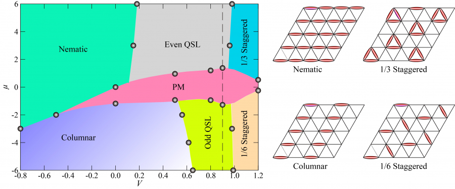 They designed a new triangular lattice quantum dimer model with soft constraints to be as close as possible to experiment conditions and developed the sweeping cluster algorithm for quantum Monte Carlo simulations that could solve such soft-constrained quantum many-body systems efficiently. Their simulations and theoretical analysis successfully map out the expected phase diagram of Rydberg arrays on the Kagome lattice (as shown in Fig.3). They found not only the expected and conventional nematic and stagger types of the solid phases but also the exotic highly entangled Z2 quantum spin liquids (QSL) with large parameter regimes in the phase diagram.