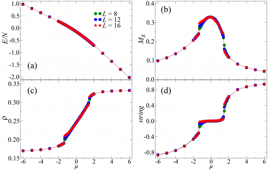 Illustration: Phase transitions between QSLs and the PM phase. Data along the QSL–PM–QSL path, indicated by the dashed line at V = 0.9 in Fig. 2. (a) The energy density is smooth with increasing µ. (b) The polarization Mx reveals the first-order phase transition between the PM phase and the two Z2 QSLs. (c) The dimer filling changes continuously in the PM phase, and the filling also exhibits a first-order phase transition between the PM phase and QSLs. (d) The string operator is zero in the trivial PM phase but positive (negative) in the even (odd) Z2 QSL.