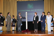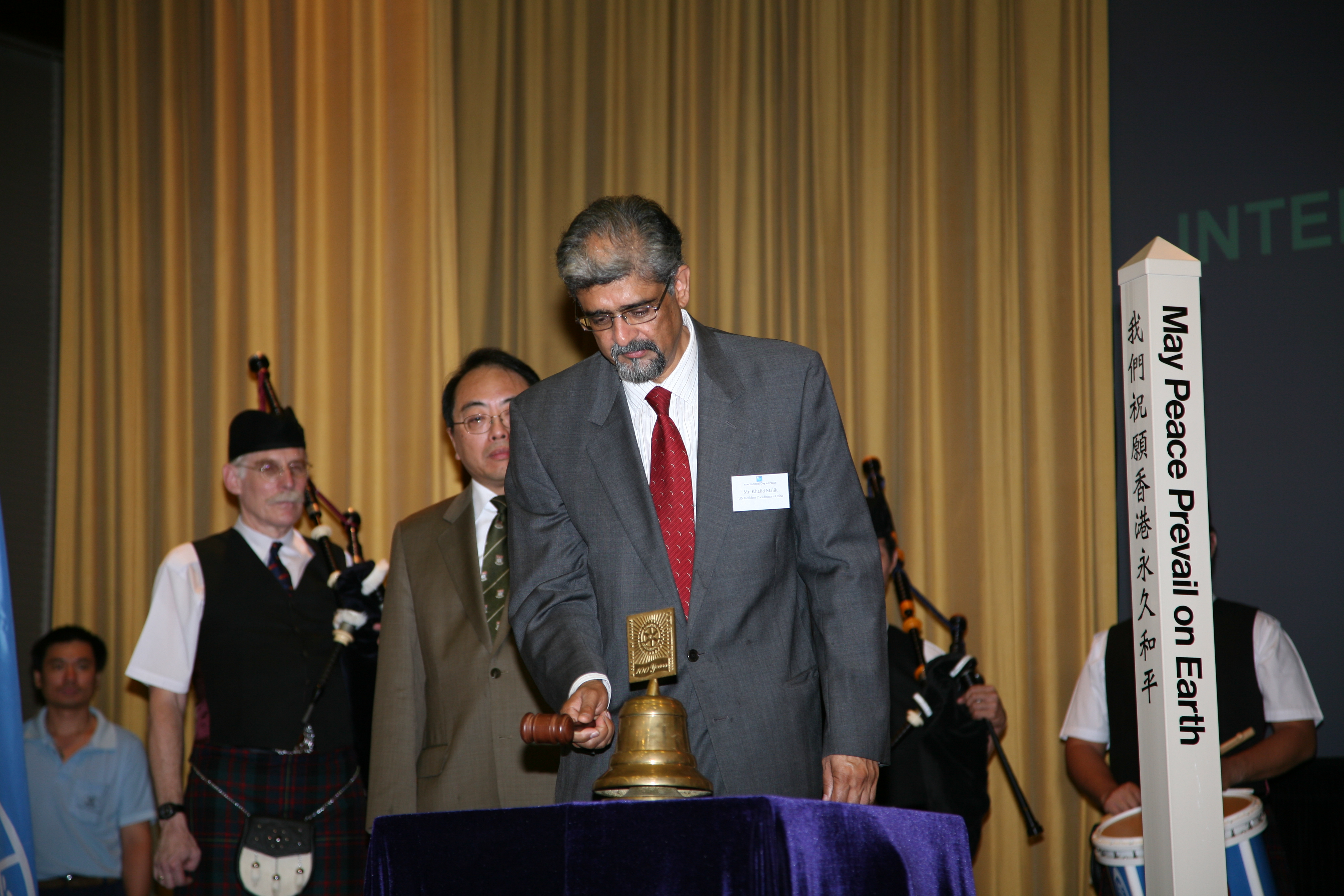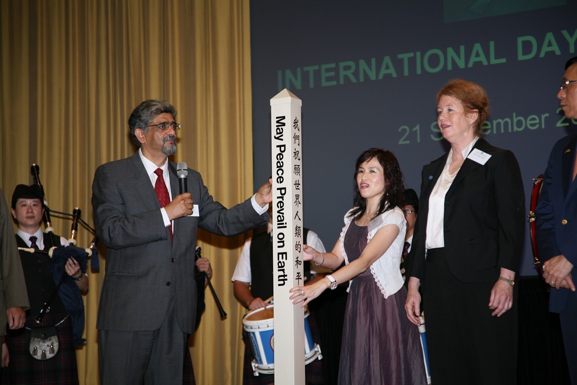 Mr Khalid Malik, UN Resident Coordinator - China, officiated the introduction of the Peace Pole and ringing of Peace Bell at the ceremony. Together with Dr Albert Wong, District Governor of Rotary International District 3450, and Professor Lap-Chee Tsui, Vice-Chancellor of HKU, Mr Malik led the participants to observe one-minute silence.