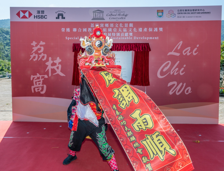 香港特區行政會議召集人陳智思先生出席作為典禮的特邀嘉賓。他發表主題演講,強調項目開創了鄉郊社群活化的行動模範。聯合國教科文組織曼谷辦事處文化部專員楊碧幸博士代表聯合國教科文組織透過錄像致辭,稱讚項目別具創意地示範了可持續發展的原則如何能夠互相強化遺產地內外的文化遺產保育工作。龍炳頤教授代表聯合國教科文組織頒獎。主禮嘉賓包括香港大學基金副主席潘燊昌博士、港大社會科學學院院長夏偉立教授、滙豐香港區署理行政總裁林慧虹女士,以及荔枝窩村兩位村長曾亞七先生和曾偉業先生。