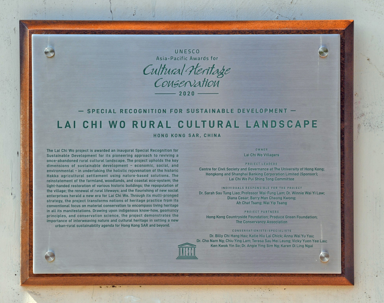 聯合國教科文組織在2020年新設「可持續發展特別貢獻獎」,同時更新了獎項的評審標準,以突顯文化遺產對可持續發展的角色和貢獻在《2030年可持續發展議程》框架中的重要性。「荔枝窩鄉郊文化景觀」項目在亞太區九個國家共48個申請中獲選為「可持續發展特別貢獻獎」的兩個得主之一。評審團讚揚荔枝窩項目以創新方式推動鄉郊永續發展,「採用以自然為本的方案,從可持續發展的三個重要方向 - 經濟、社會與環境,全面復興這條歷史悠久的客家農村」。項目詳情請瀏覽 https://ccsg.hku.hk/ruralsd/