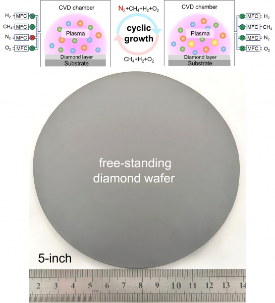 為克服上述限制,團隊創新採用「微波等離子體化學氣相沉積(MPCVD)」技術,配合高頻循環脈衝氮摻雜工藝,在金剛石生長過程中構建動態非平衡環境,成功實現英寸級超硬晶圓量產關鍵突破。透過在等離子體中以高頻方式交替加入氮源,使等離子體活性基團的組成和生長溫度在極短時間內持續發生波動,從而打破傳統穩定生長模式限制。這種動態調控機制不僅強化表面重構與缺陷過程,還有效促進特殊微觀結構形成。新技術讓金剛石在保持高純度和高緻密度,為超大尺寸超硬材料的規模化生長提供了新的技術途徑。